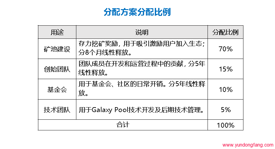GPO英文全称为Galaxy Pool Coin,是一种全新的链上资产发行方式。GPO是基于以太坊创建的ERC-20去中心化区块链数字资产,采用智能合约进行首次数字资产发行。通俗的讲,就是参与者将GPO资产当做矿机,来挖出其他多种数字资产,通过矿池利润回购销毁的方式获得GPO的增值收益。通过这种全新的链上资产发行方式,能为投资者提供随时撤出的更符合人性的投资机会。GPO 发行总量为6 亿枚,且保证永不增发,主要发行方案如下: