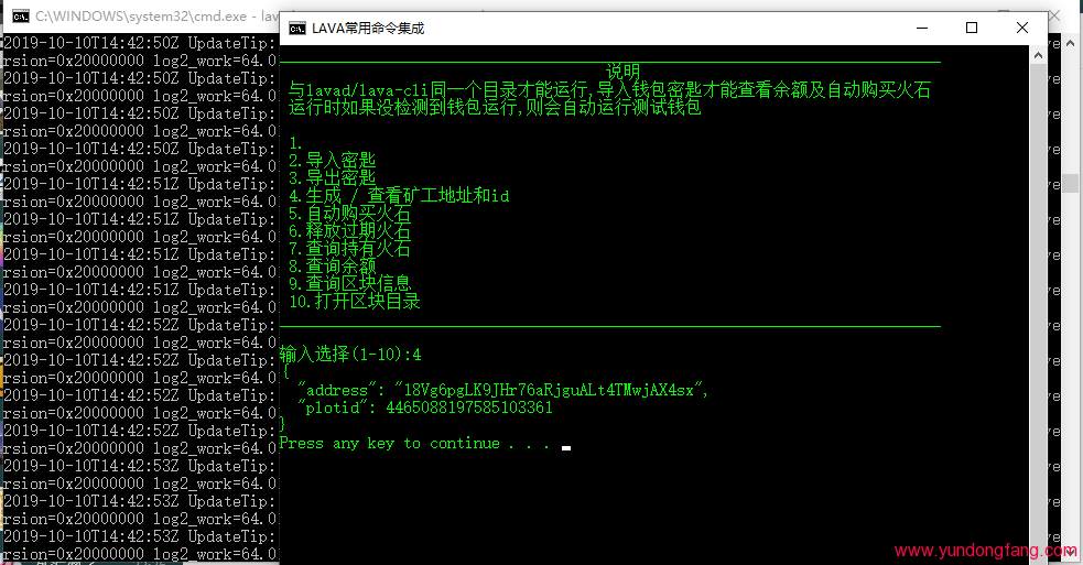 然后运行【lava常用命令集合.bat】看到如下图所示界面。最好是等节点按一下这【4】然后回车,就会看到钱包地址和PID号。把它复制出来。再任意键回到能输入序号的界面。