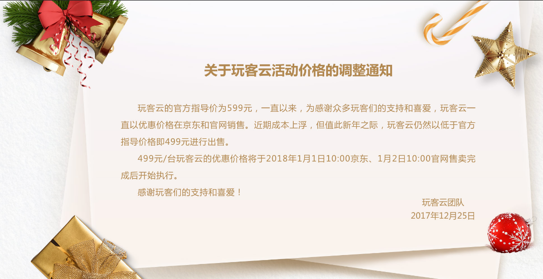 499元/台玩客云的优惠价格将于2018年1月1日10:00京东、1月2日10:00 官网售卖完成后开始执行。